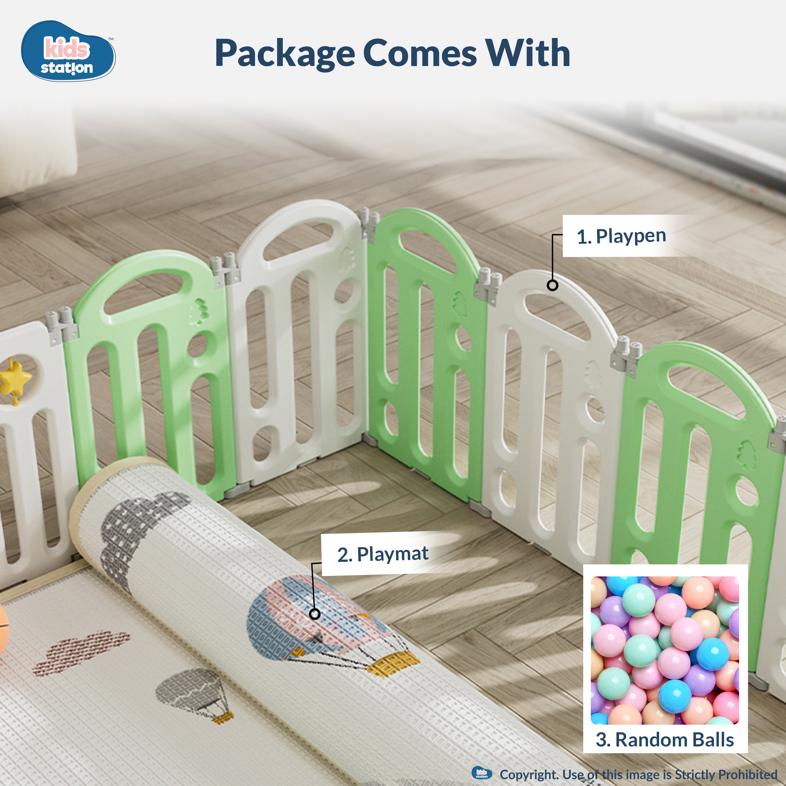 Package Includes: Play Yard + Playmat + 20 Balls + Basketball Hoop