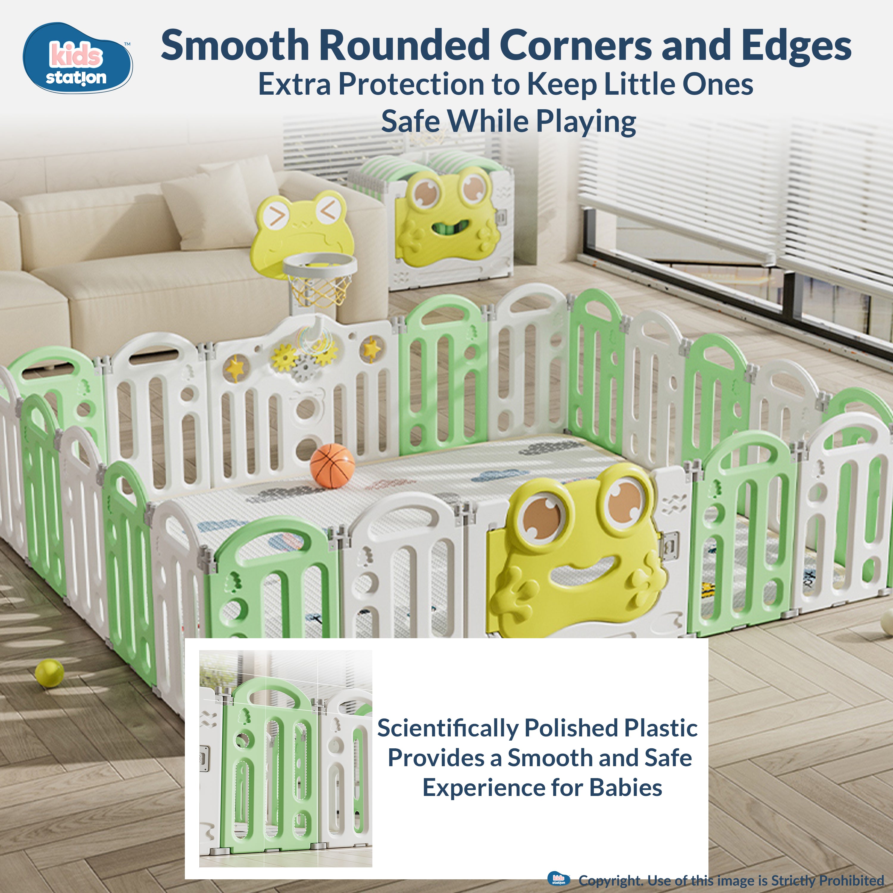 Kids Station Play Yard with Playmat, 20 Balls & Basketball Hoop (Frog Series)