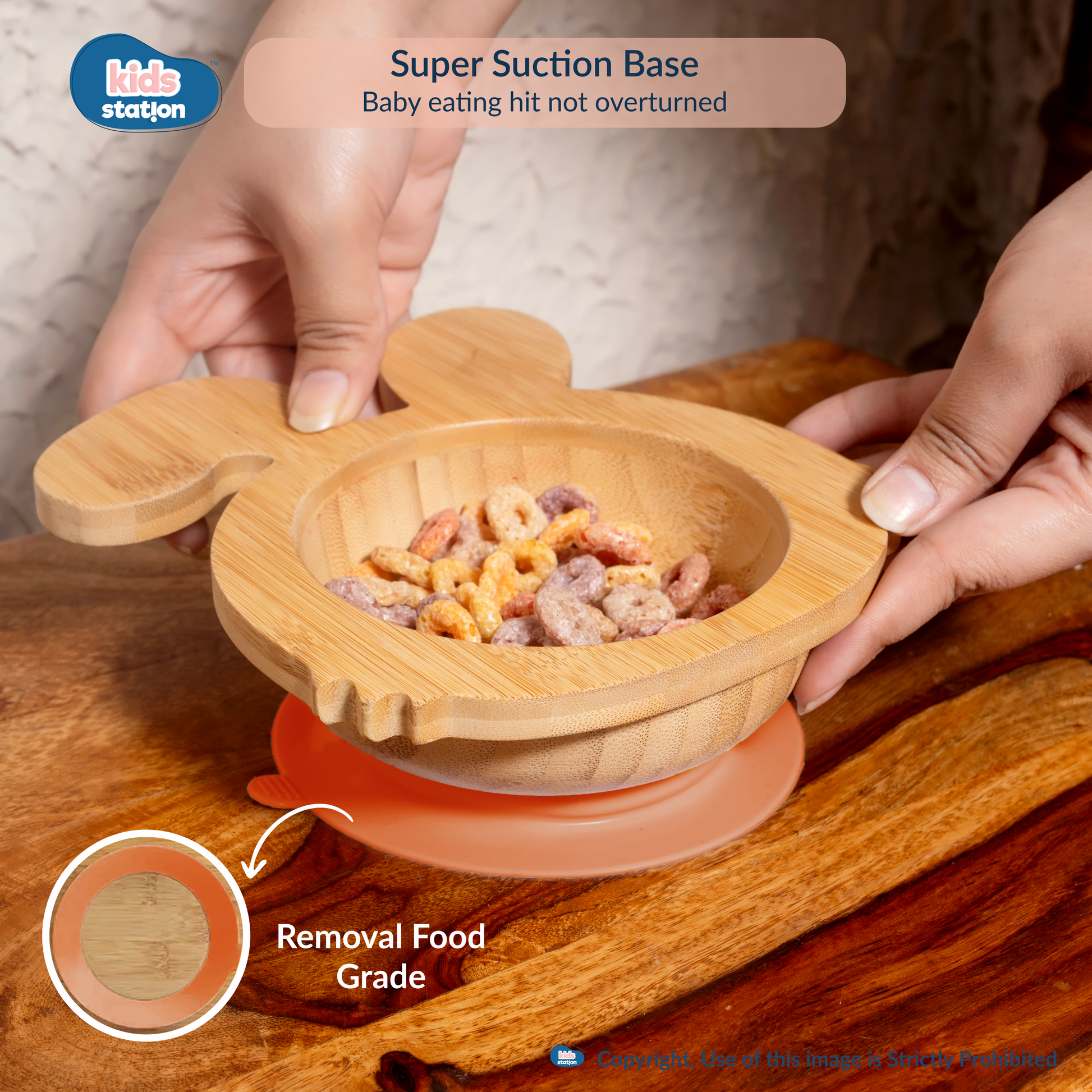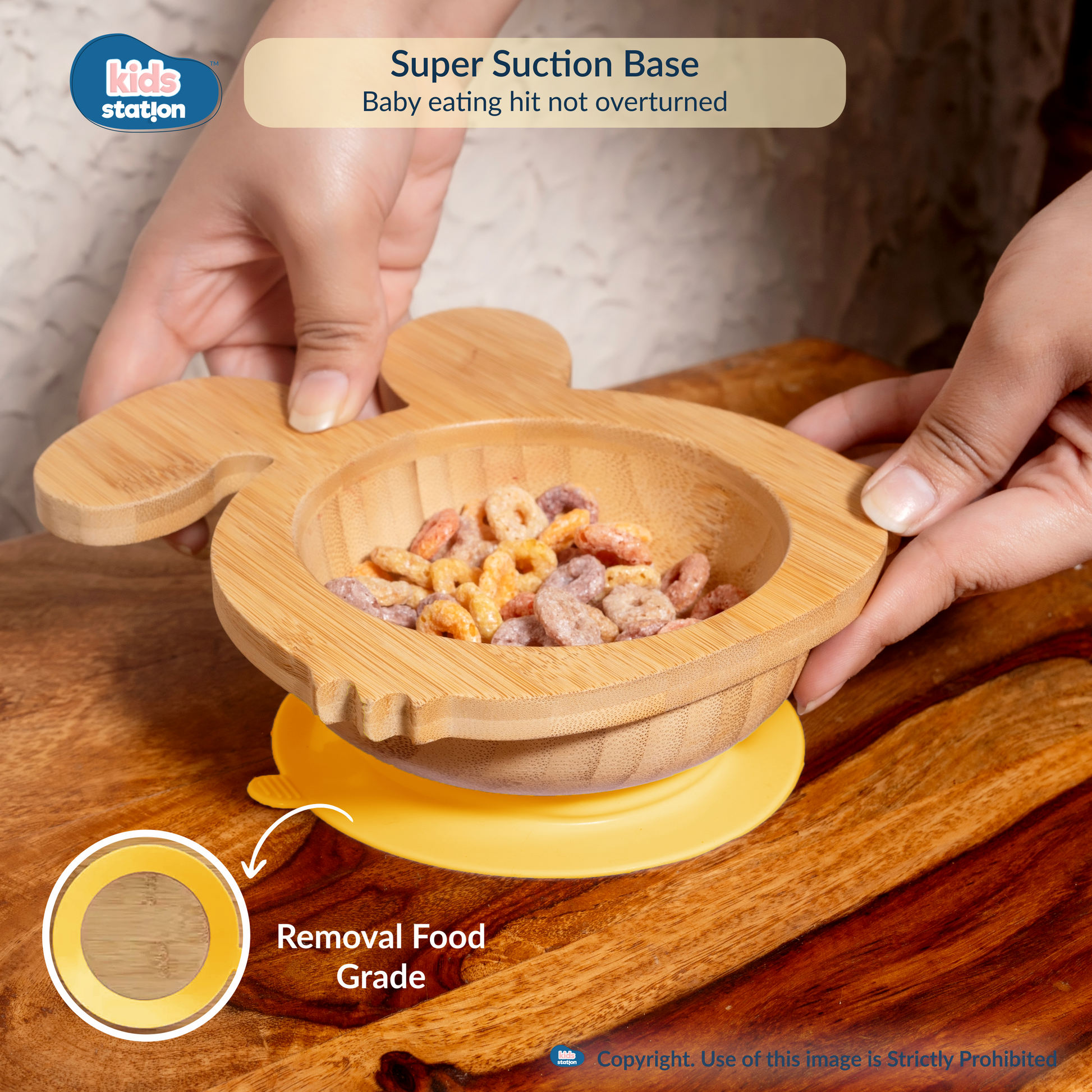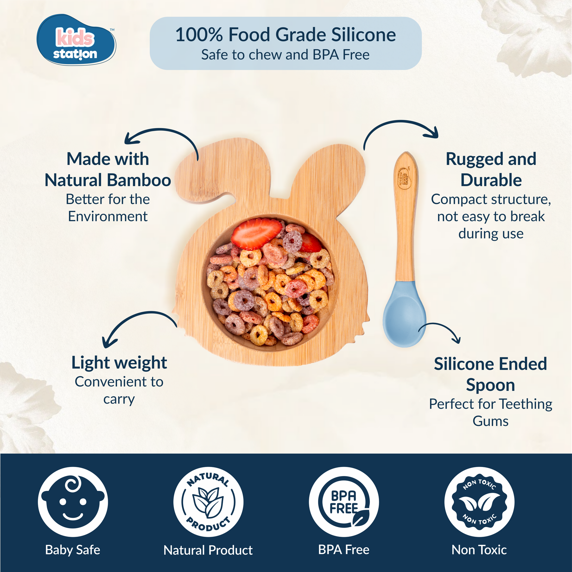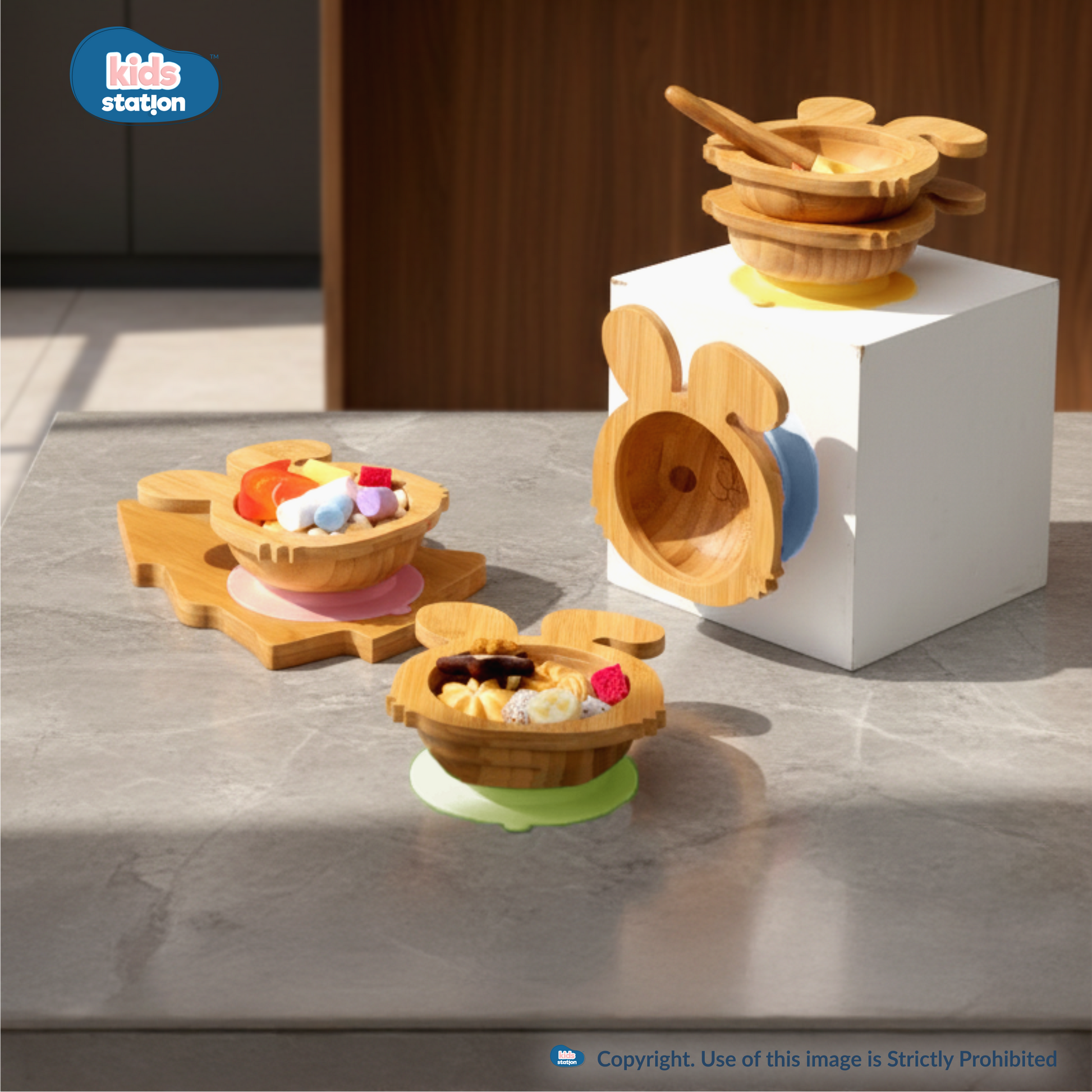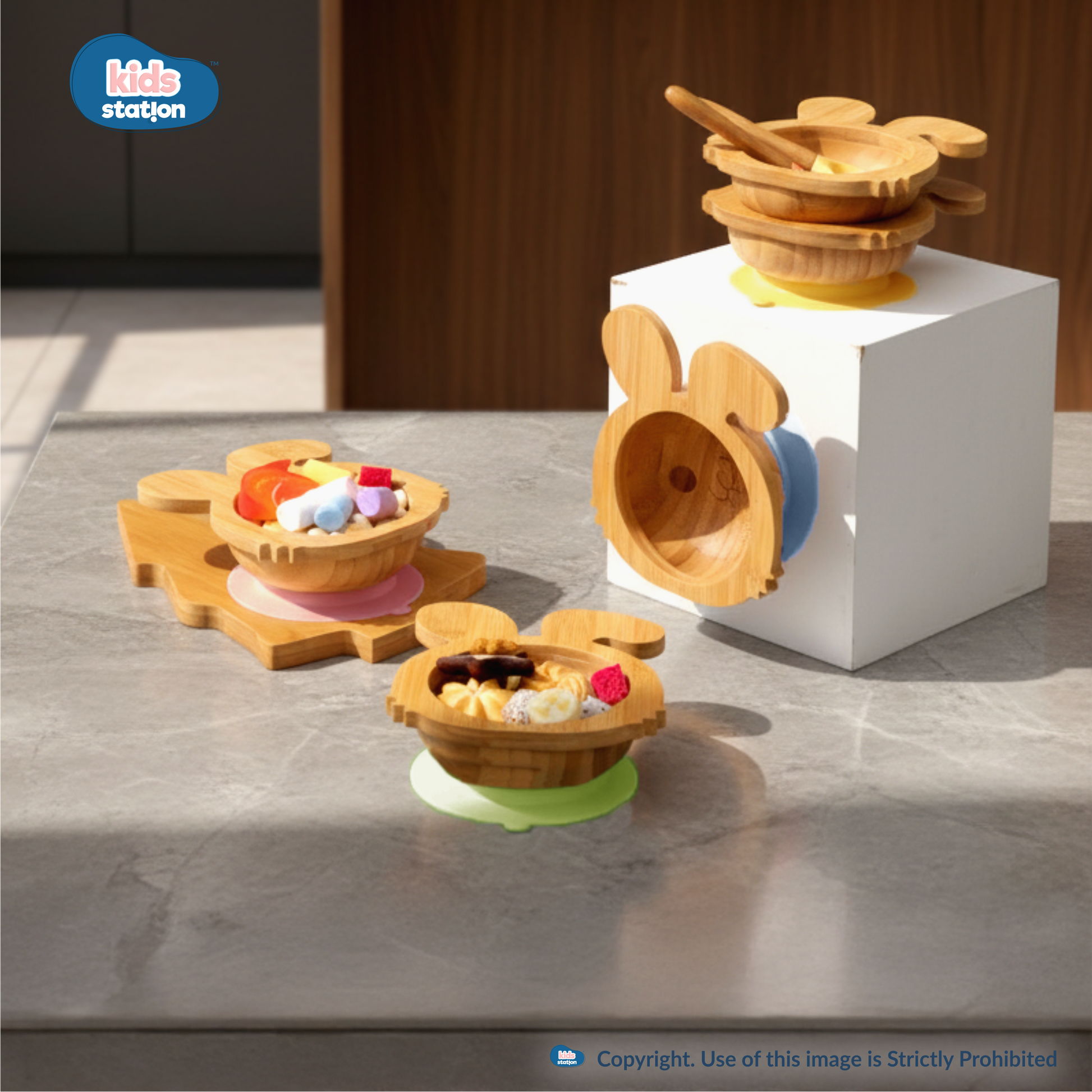 Depending on the design, each set includes a bamboo plate or bowl, matching spoon and fork, and in some sets — a bib or sipper.