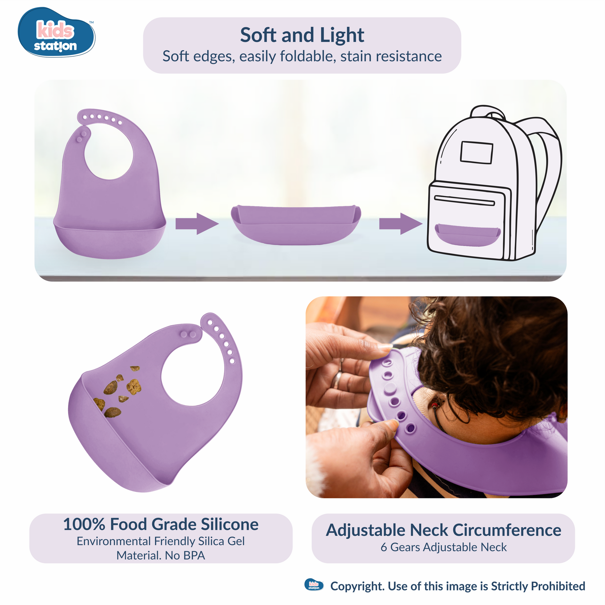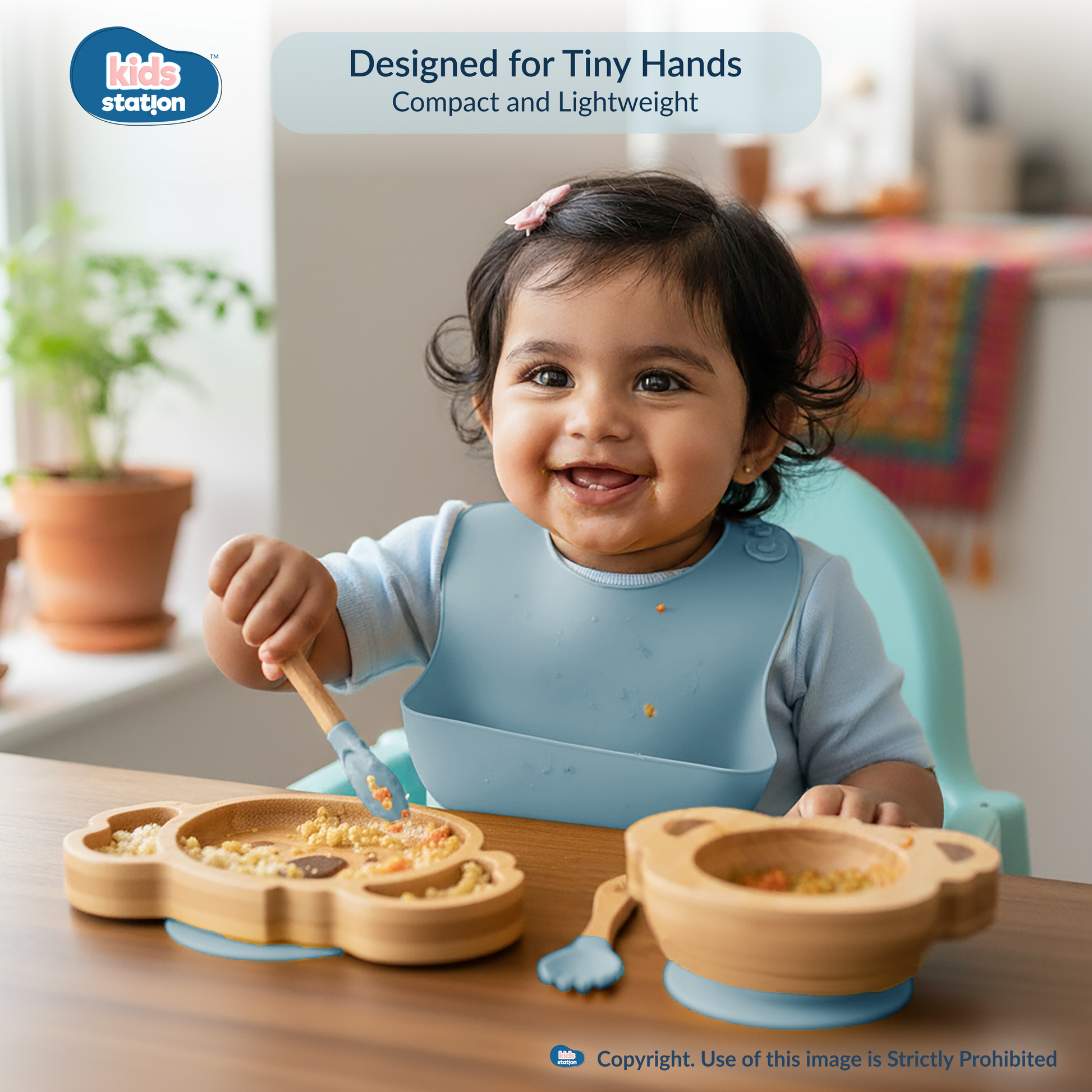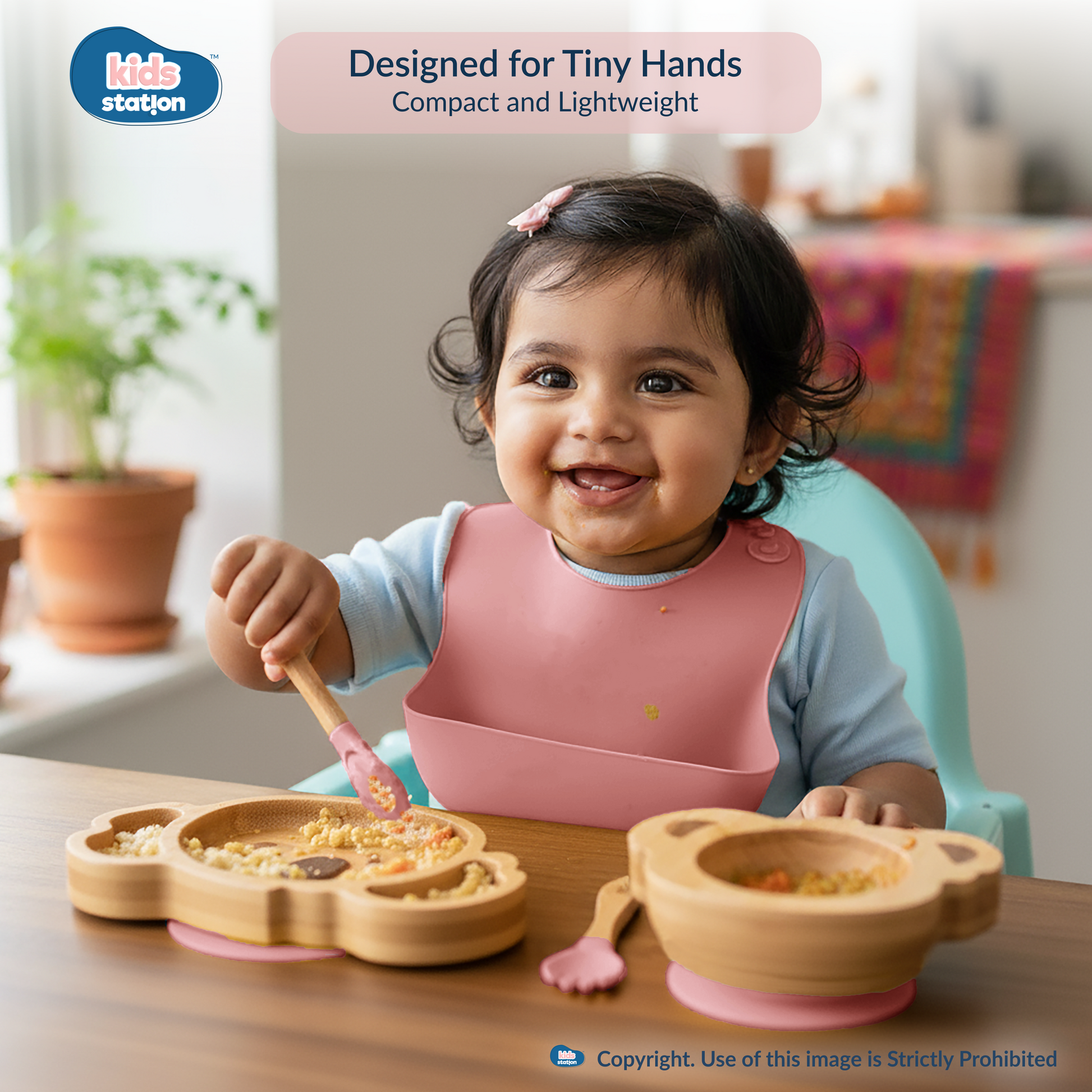 I’m the Kids Station 3-in-1 Feeding Set, designed to make your baby’s mealtime fun and fuss-free! With a soft bamboo bowl, matching spoon, and an easy-to-clean bib, I help keep mealtimes neat, safe, and happy for both parents and little ones.