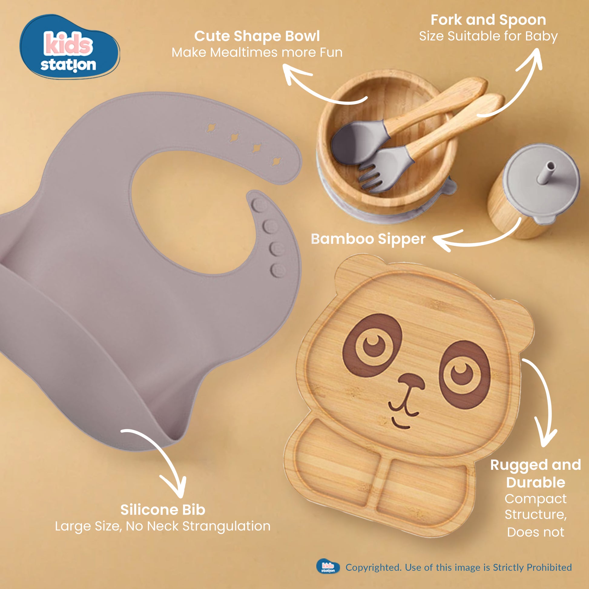 Depending on the design, each set includes a bamboo plate or bowl, matching spoon and fork, and in some sets — a bib or sipper.