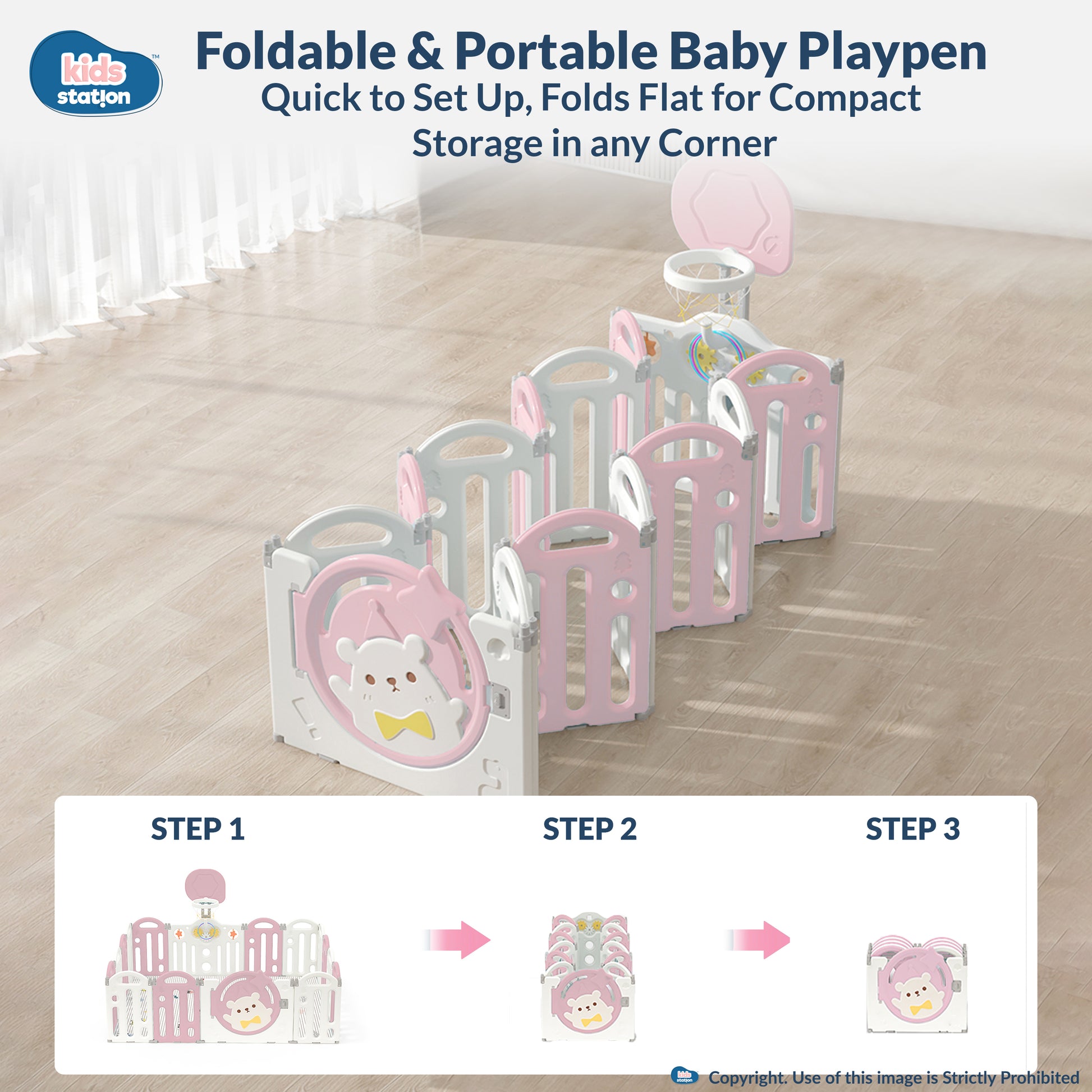 I’m the Kids Station Pink Bear Design Baby Play Yard — your baby’s safe and happy play corner! With my adorable bear theme and sturdy build, I create a secure space for endless fun. I also come with a built-in basketball hoop and colourful play balls, turning every playtime into a mini adventure that keeps your little one active and entertained.