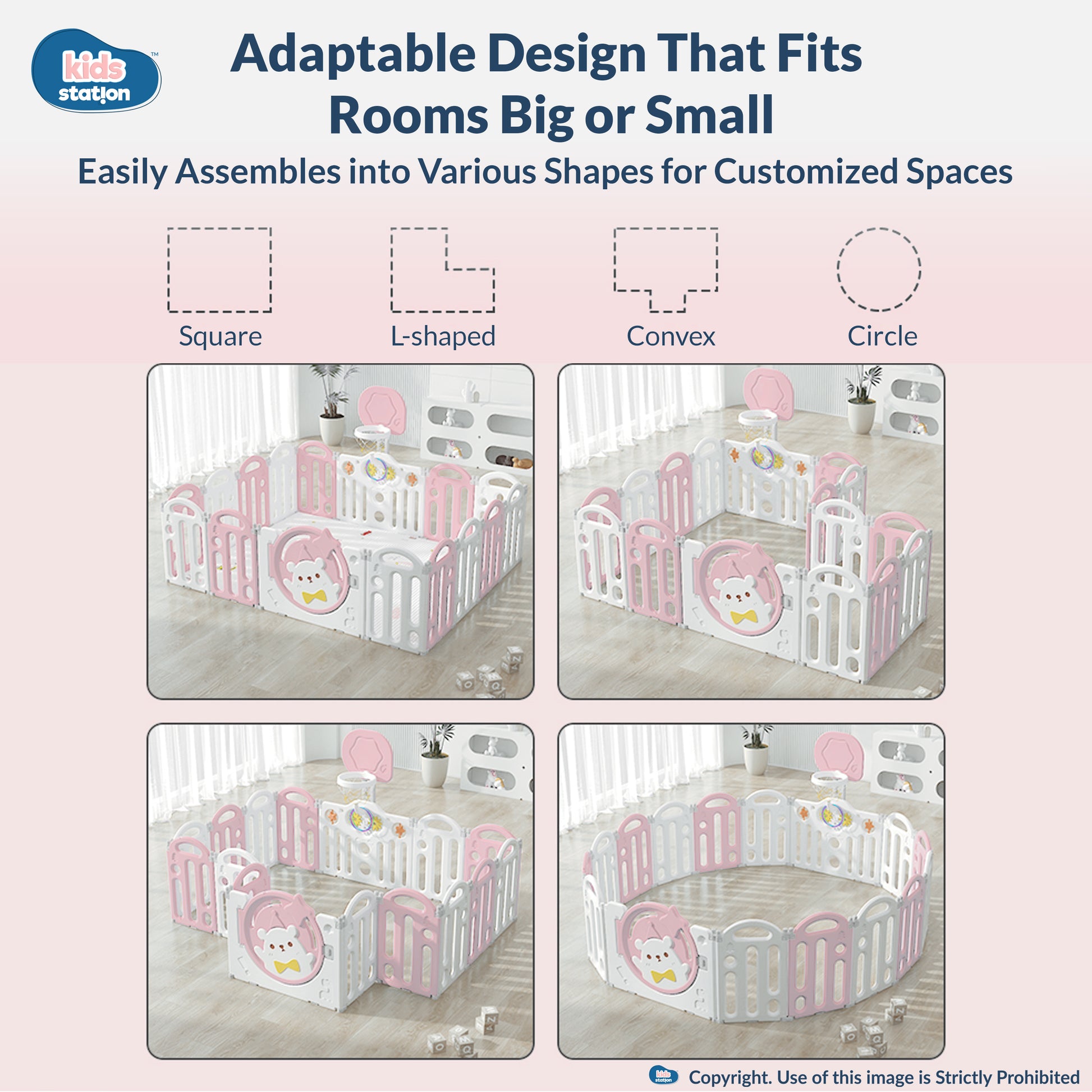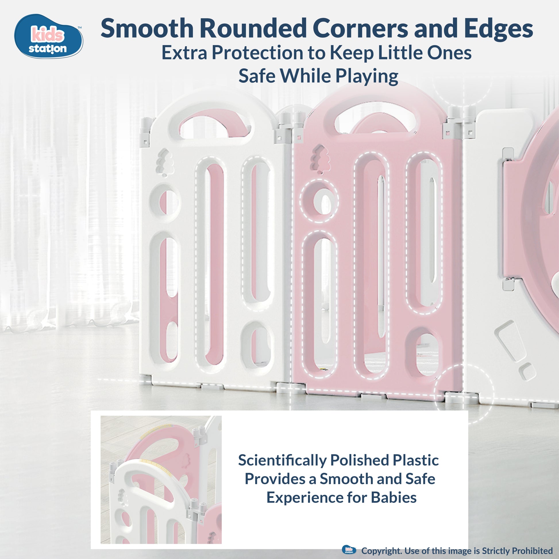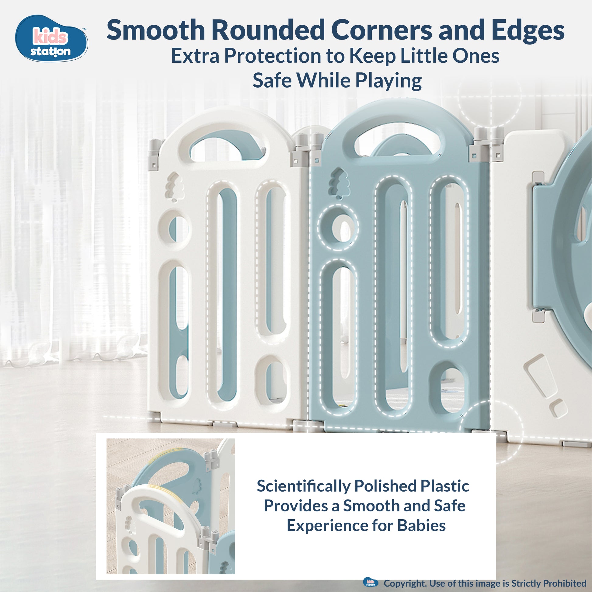 Kids Station Play Yard is made of premium HDPE plastic — sturdy, lightweight, waterproof, and easy to clean. Each panel is fitted with non-slip rubber pads and suction cups for extra stability, preventing sliding or tipping.