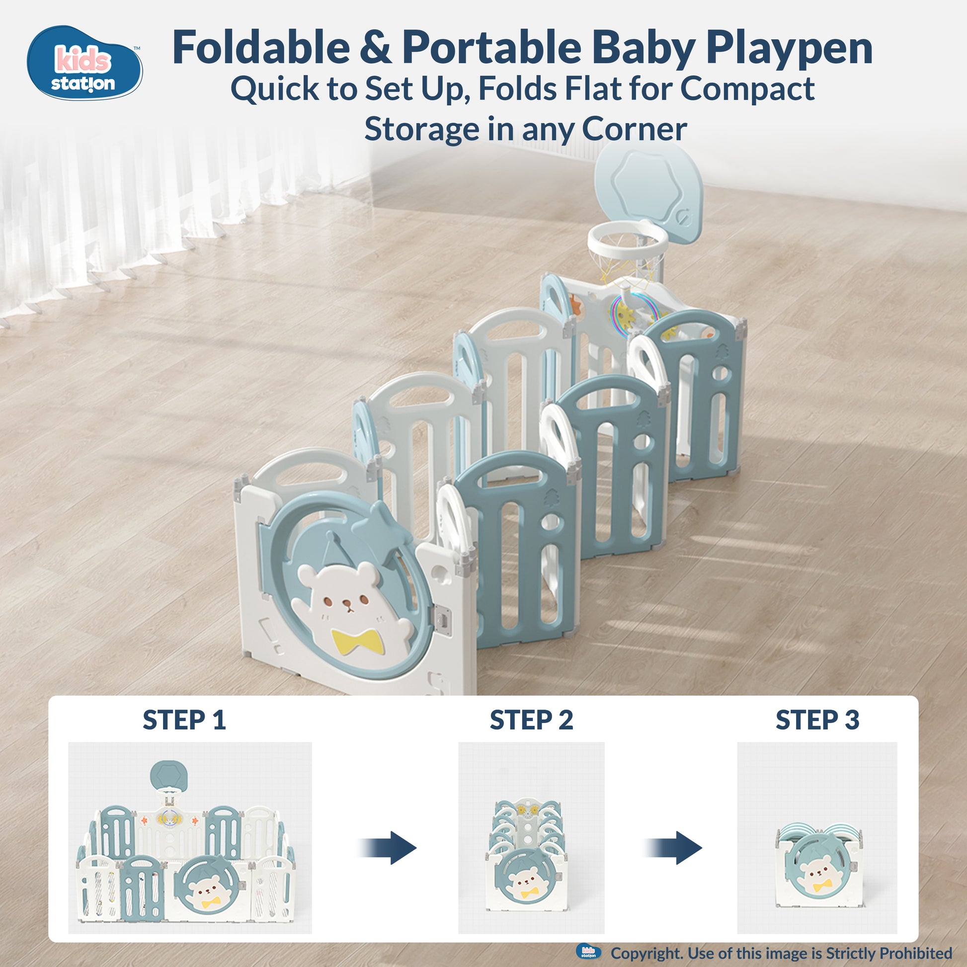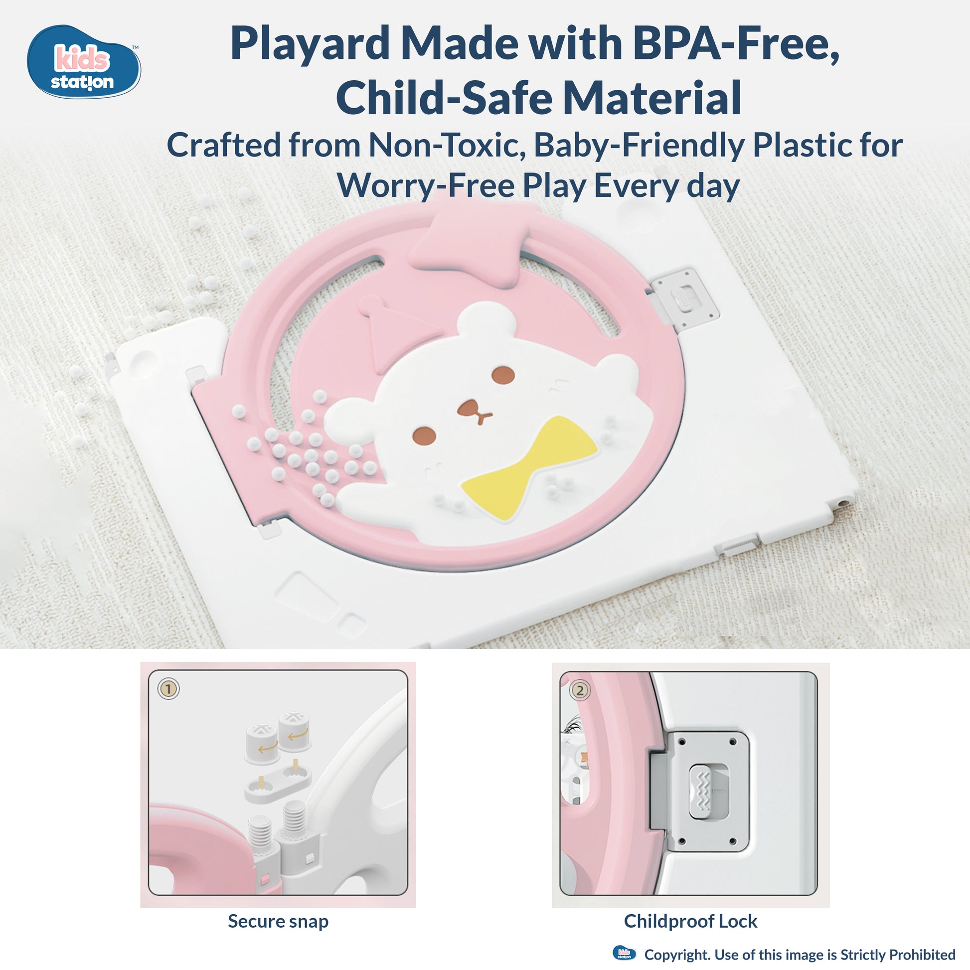 I’m the Kids Station Little Bear Design Baby Play Yard — a safe, sturdy, and adorable space for your baby to play and explore. With my soft pastel bear theme and durable panels, I create a secure play area where your little one can crawl, stand, and have fun safely.